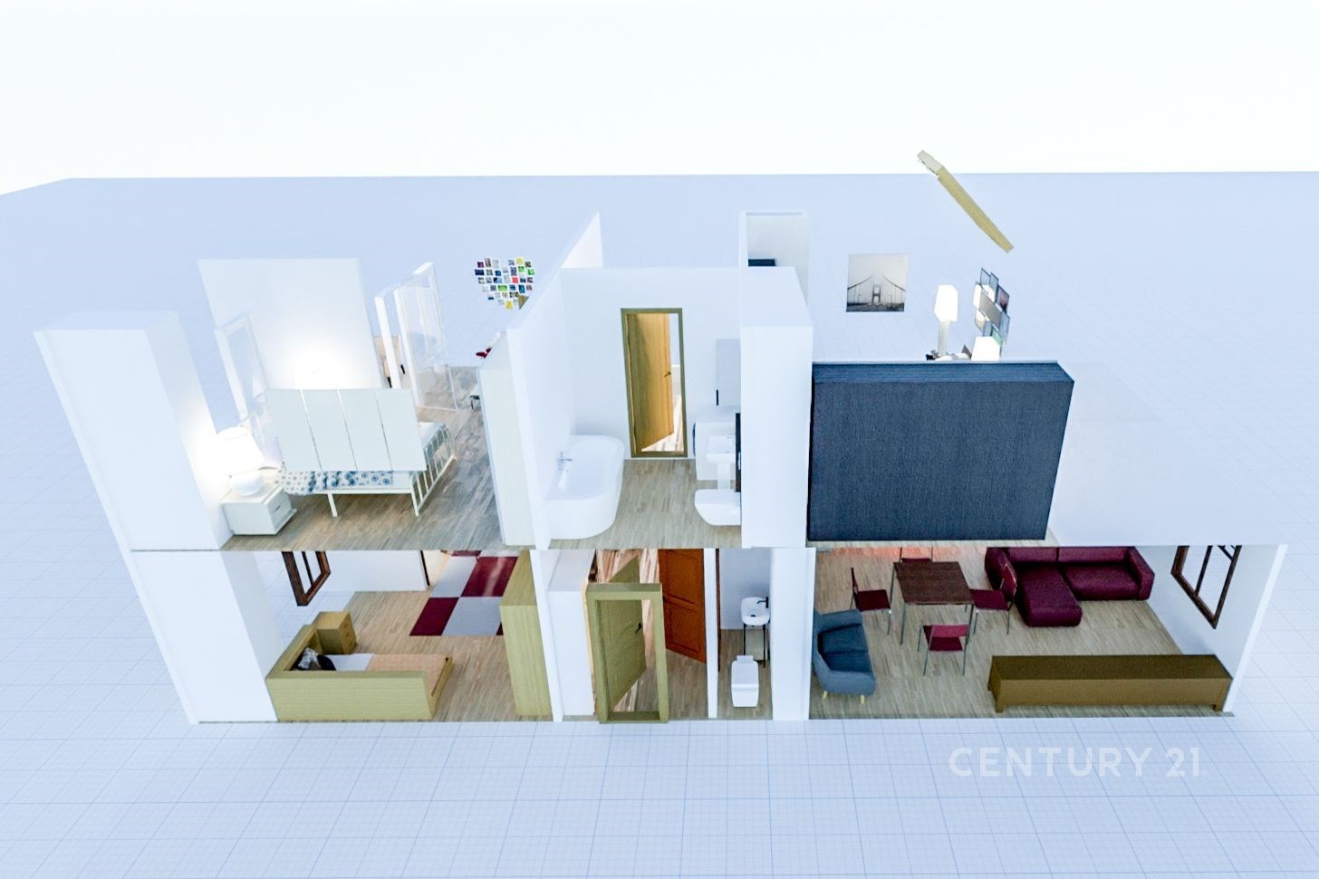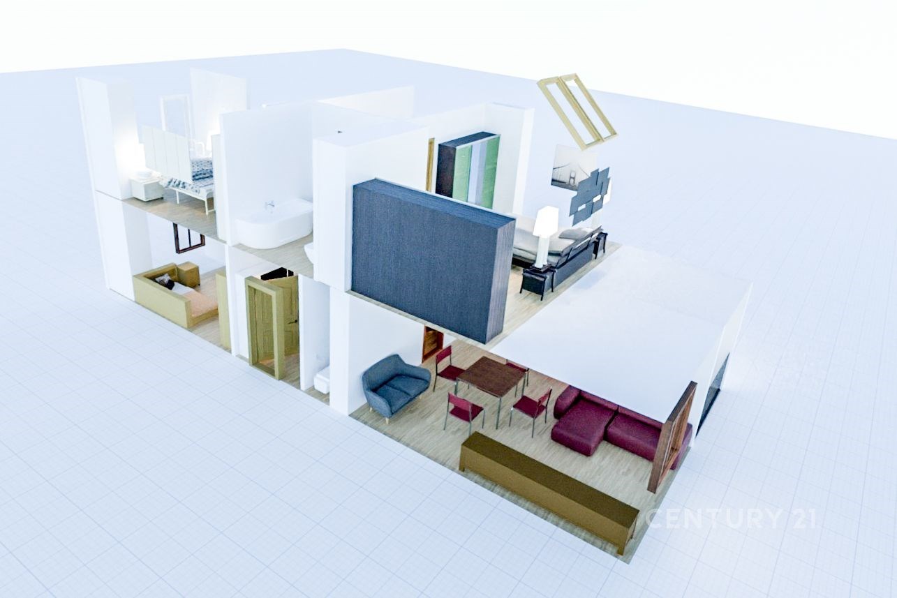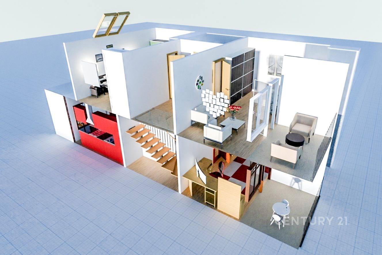 Fotografie 12/17 Řez moderním domem s parketovou podlahou, otevřeným schodištěm a velkými okny. Interiér zahrnuje světlý design a prostorné pokoje.