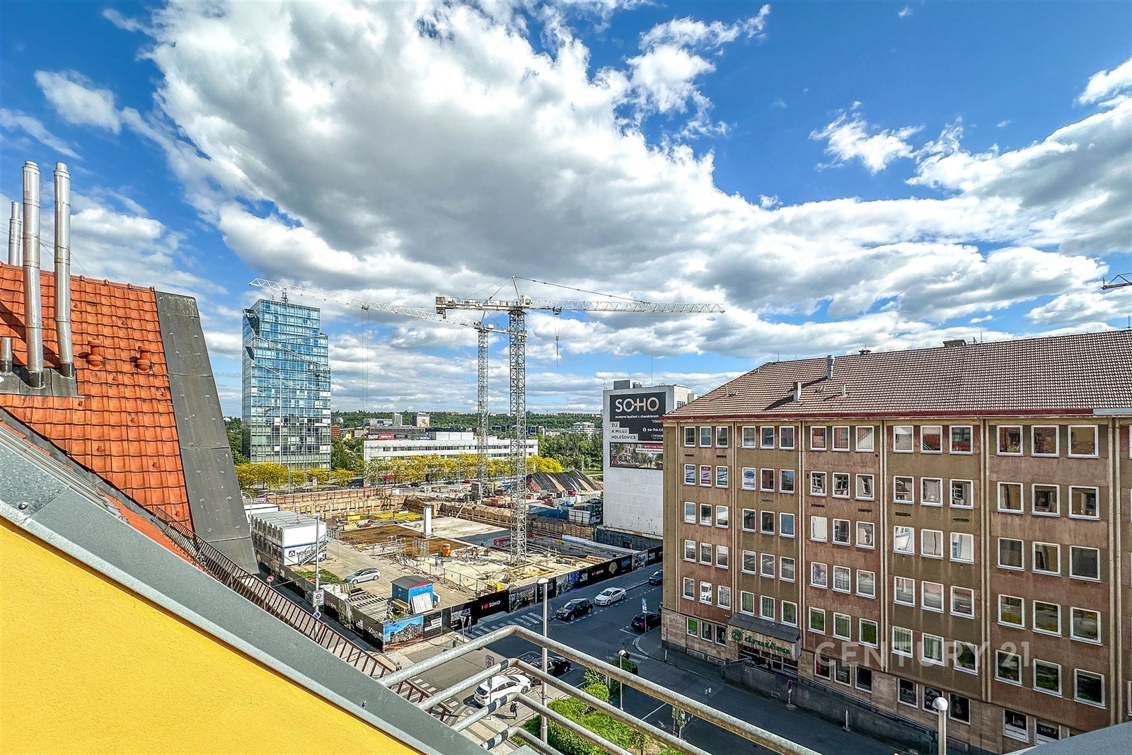 Fotografie 1/17 Balkon s kovovým zábradlím a výhledem na město, světlé cihlové budovy s červenými střechami, modrá obloha s mraky